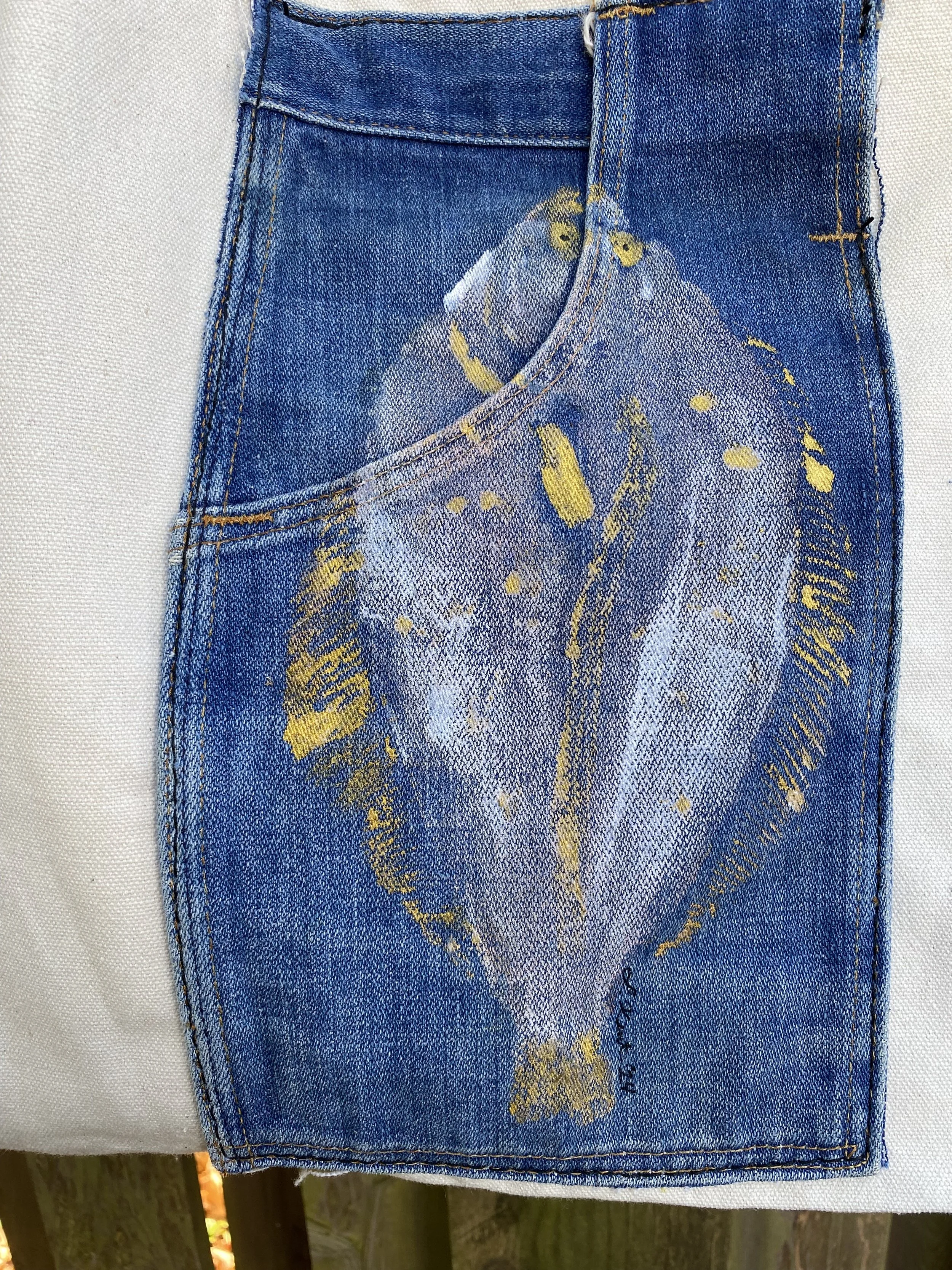 Original flounder print on recycled “fishy” pants.